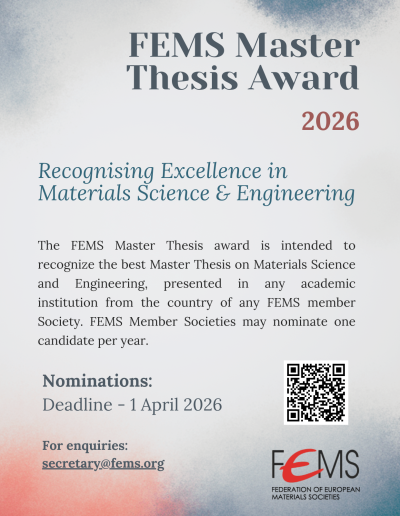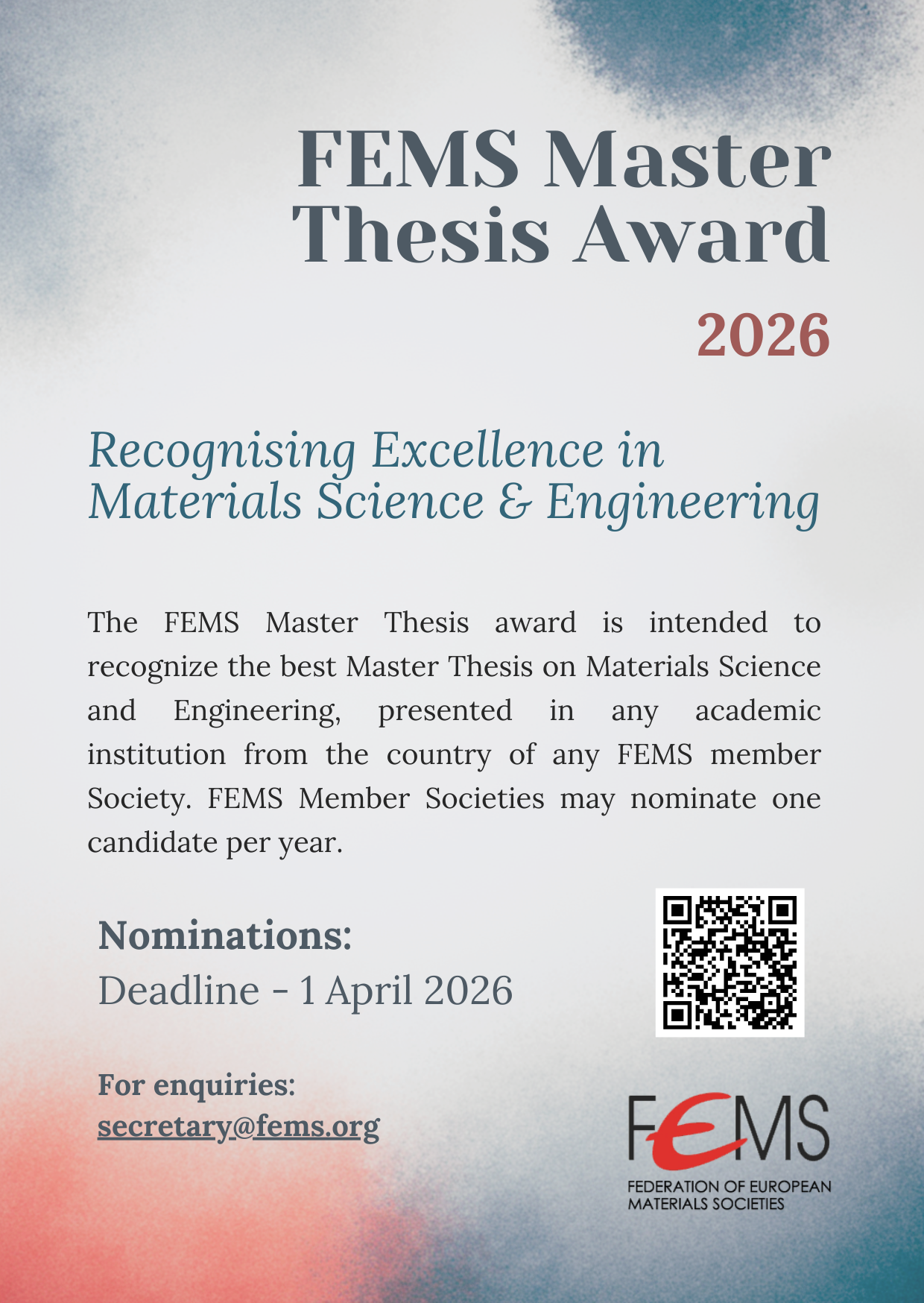 The FEMS Masters Thesis award is intended to recognize the best Masters Thesis on Materials Science and Engineering, presented in any academic institution from the country of any FEMS member Society. FEMS Member Societies may nominate one candidate per year.